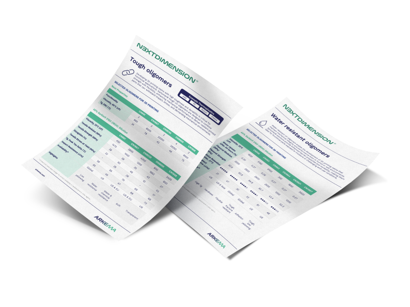 Arkema continues to drive the future of additive manufacturing with a range of 3D printing oligomers to deliver the right balance of mechanical performance, reactivity, and surface properties across every formulation need — from flexible and impact-resistant resins to rigid and high-temperature materials.